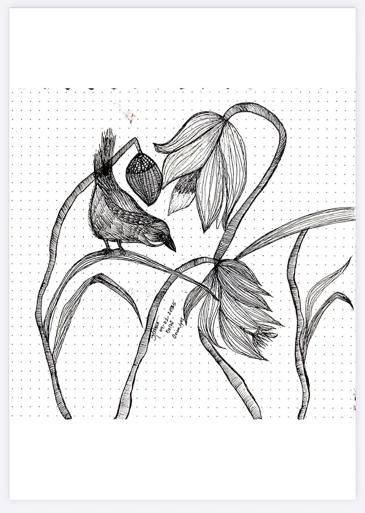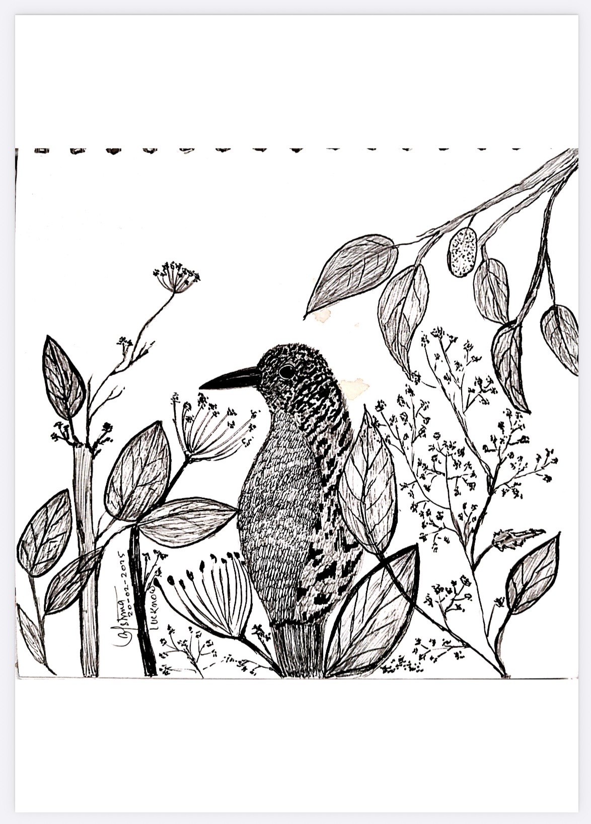 In this delicate ink composition, a lone bird rests among slender stems, leaves, and flowering forms, becoming one with the…