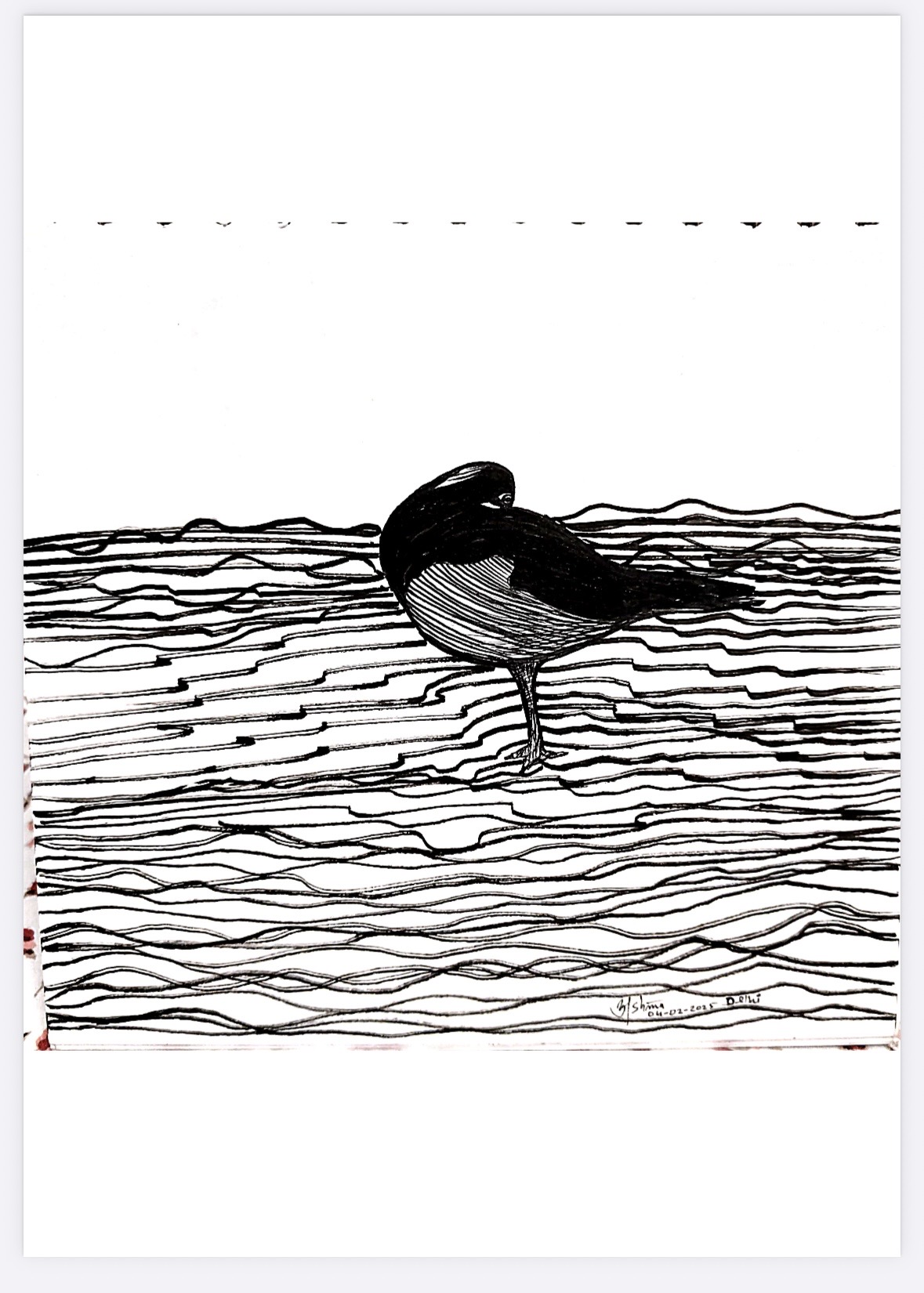 Rendered in stark black ink, this minimalist composition captures a solitary bird standing amid flowing, restless lines—suggestive of water, wind,…