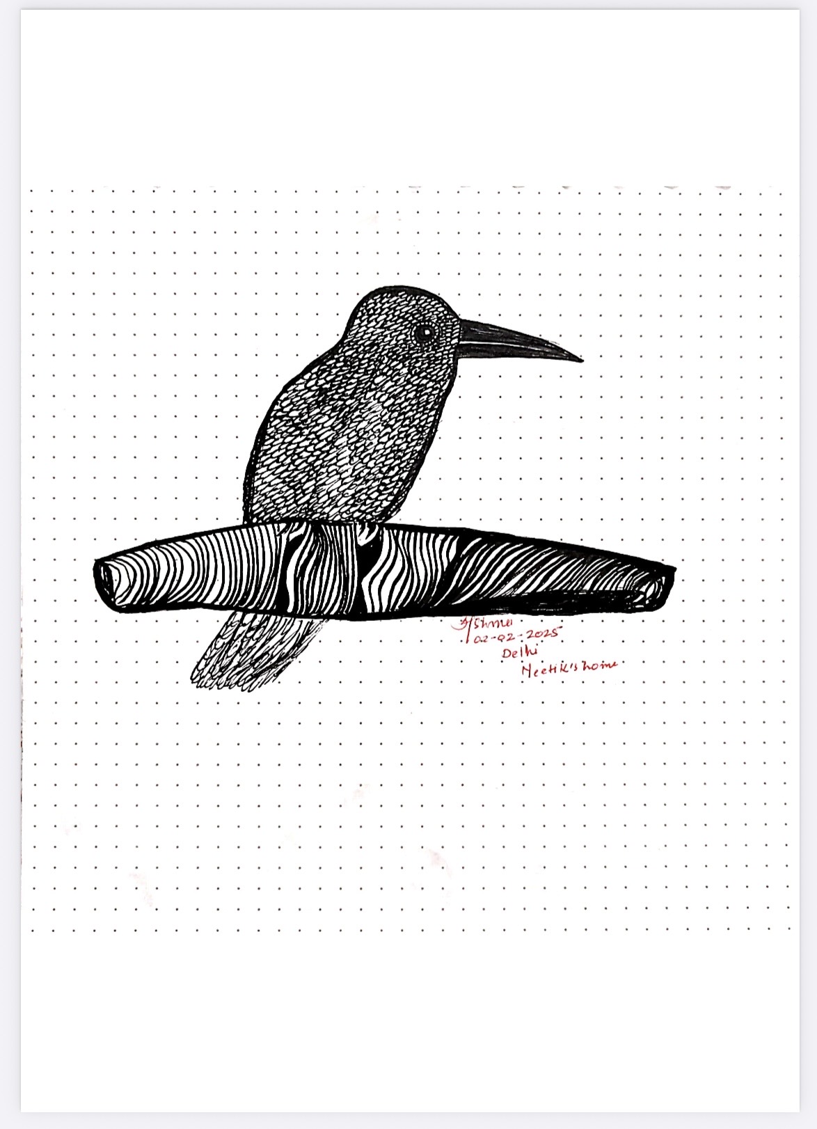 This minimalist ink drawing presents a solitary bird perched on a cut branch, suspended against a quiet field of dotted…