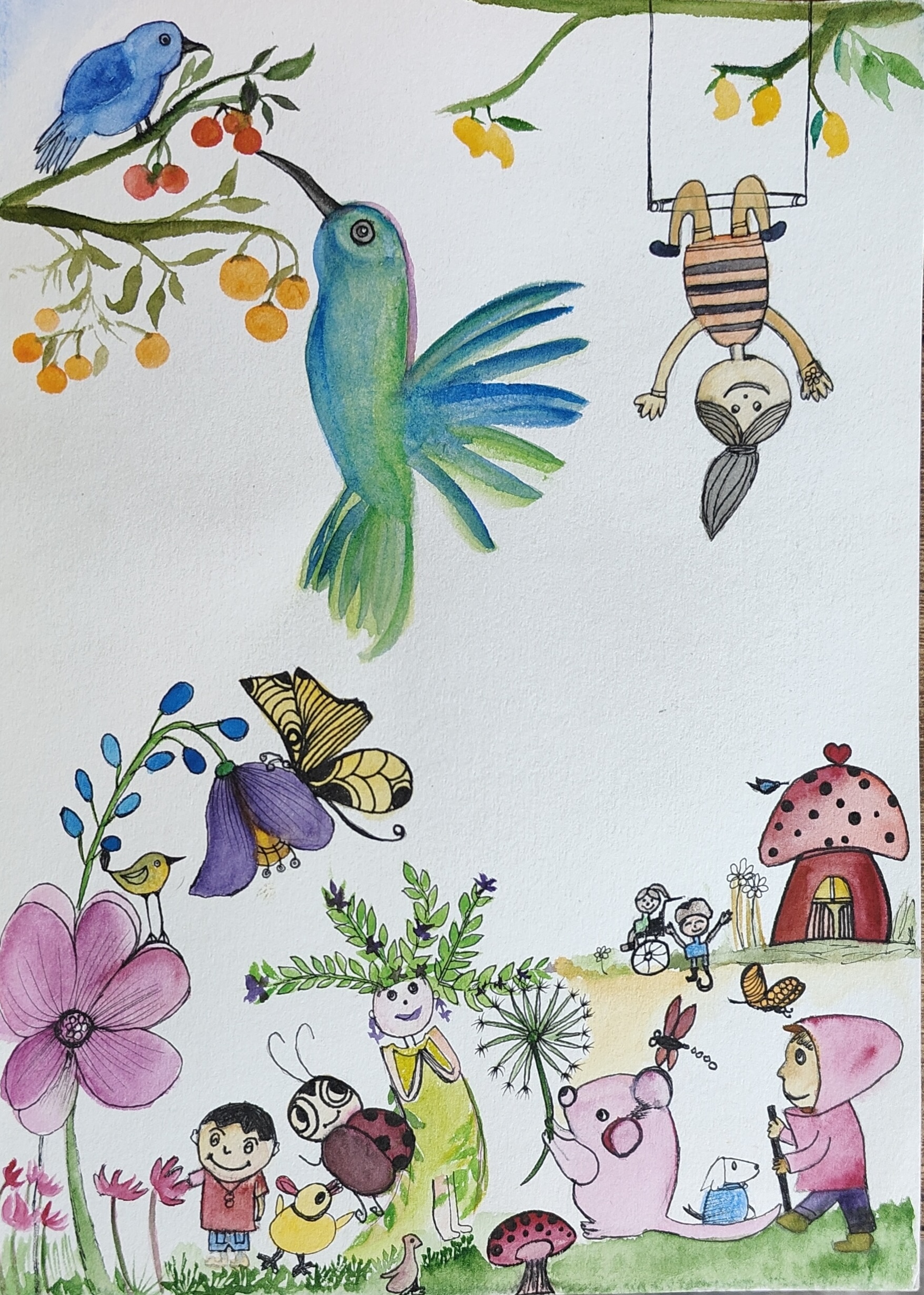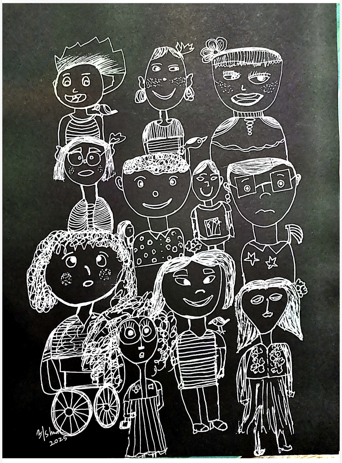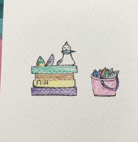 This playful, minimalist drawing brings together a stack of books, a tiny bird, and a handful of fish rendered in…