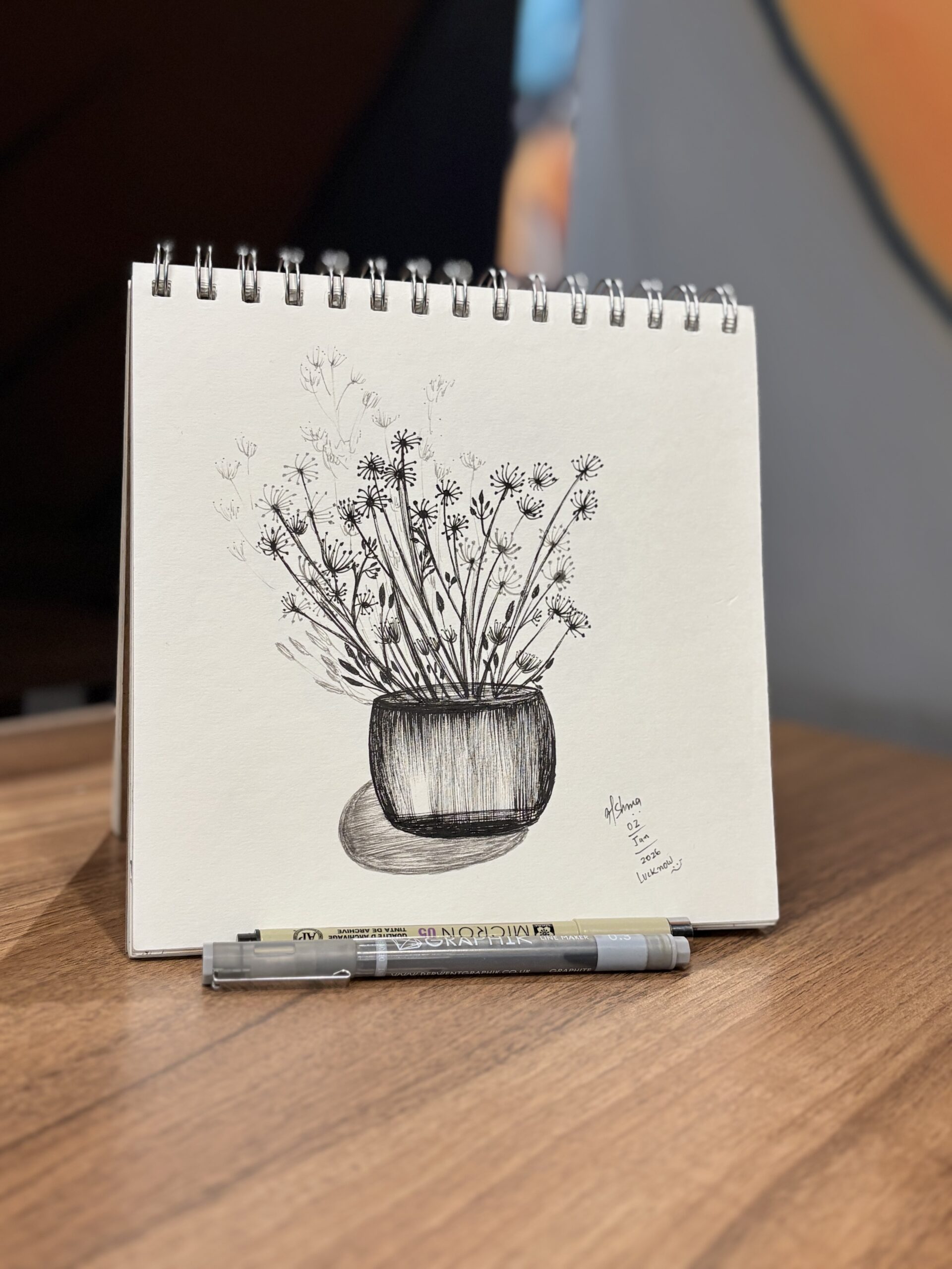 This ink drawing captures a modest pot of wildflowers, rendered through layered lines and soft shading. The composition celebrates everyday forms, allowing simplicity and restraint to hold emotional depth.